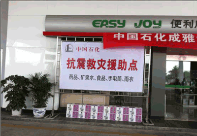 升級改造暫時關(guān)閉的成雅油料“石象湖加油站”,特別設(shè)立了“流動應急加油車”,流動能源!為愛加油!讓生命延續(xù)!也開始為抗震救災車輛提供充足的燃油供應。而中國石化四川石油分公司雅安“天全縣始陽加油站”,在自身遭受地震影響頑強自救的情況下,依然想方設(shè)法為抗震救災車輛提供支持,并為過往受災人員和救災人員發(fā)放飲用水,為趕往災區(qū)的媒體提供特別應急網(wǎng)絡(luò),便于向外界發(fā)布實時消息。