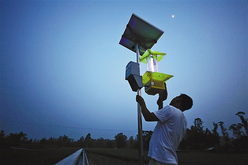 6月17日傍晚,大足區龍崗街道明星村3組的稻田間,工作人員正在調試新安裝的頻振式太陽能殺蟲燈。這種殺蟲燈可誘殺螟蟲、稻飛虱、稻苞蟲等10余種水稻害蟲,減少農藥用量;同時,還具有光照和濕度雙重智能化控制功能,可實現晴天夜間自動開啟,白天和雨天自動關閉。當前正是水稻拔節孕穗期,由于入夏后病蟲害增多,水稻病蟲害防治進入關鍵時期,該街道已安裝200余盞頻振式太陽能殺蟲燈,殺蟲面積達5000余畝。