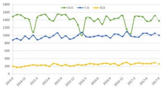 圖:2014年9月至今全國汽、柴、煤油月度消費量(單位:萬噸)