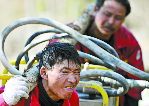| 近百公斤重的鉆機(jī)設(shè)備,兩個(gè)人扛起來爬山過坎,實(shí)在很吃力。 |