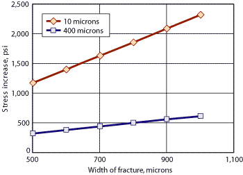 Fig. 3 . Comparison of stress at the wellbore for a fracture geometry having 10 microns of width at the propped tip versus 400 microns based on finite element analysis models. A constant shear modulus of 1 million psi is assumed.