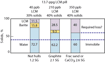 The second and third bars in Fig. 4 show that selection of LCM density is also critical because this determines the maximum concentration of LCM that may be placed within a fluid and yet retain pumpability. In this case, if an LCM of moderate 2.1-SG density is used, it is only possible for 28.5% of the total volume to be composed of this material. The remainder must be high-density barite or the total solids content will exceed the assumed 40% design threshold for pumpability. If a higher-density material, such as calcium carbonate (2.6 SG) is used, it is possible for the entire 40% solids-content volume to be LCM. In this manner, LCM is being used as both a lost-circulation material and a weighting agent. Generally, solids content is maximized by using low-density LCM for low-mud-weight applications and high-density LCM for high-mud-weight DSF.