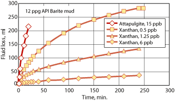 Fig. 6 . Common suspension agents, such as xanthan gum, viscosify the water phase and reduce fluid loss. The effect may be particularly pronounced in very low permeability with small pore throats.