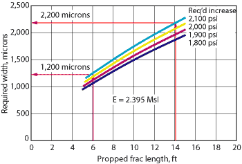 Fig. 1 . Results from finite element model showing relationship between length of propped fracture and width required at the wellbore to achieve a desired increase in stress (integrity).