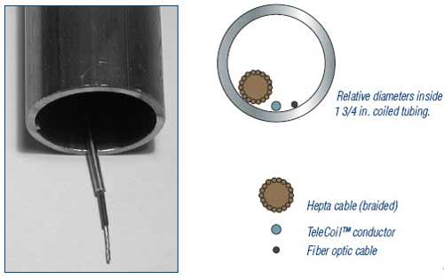 Close up of TeleCoil conductor in 1 3/4-in. coiled tubing and comparative size vs. hepta and fiber-optic cables.