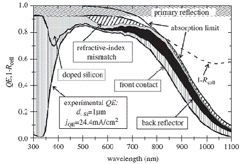 對于單結薄膜硅太陽能電池,提高其對光的吸收將提高電池的電流密度,對電池效率將產生直接的影響。Berginski等人通過實驗結合模擬給出了提高電池對光的吸收途徑,如圖1所示:可以看出薄膜硅電池的前電極對光的吸收、折射率的錯誤匹配、窗口層對光的吸收、背反電極吸收損失以及玻璃反射都會減少電池對光的吸收,因此提高電池的光吸收可從這幾個方面著手。