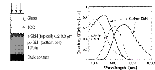 圖8 左圖:具有透明中間層的a-Si/mc-Si疊層電池的結(jié)構(gòu)示意圖,右圖:有中間層與沒有中間層的a-Si/mc-Si疊層電池的量子效率對比