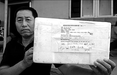 3.養(yǎng)殖戶展示采集扇貝的證據(jù)封簽,以作為將來索賠的證據(jù)。他們邀請?zhí)旖蛞患液Q笱芯克墓こ處熀吞粕绞泄C處工作人員共同采集了30箱這樣的證據(jù)。