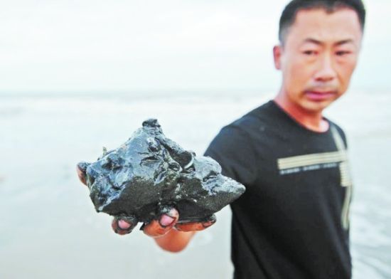 9月3日,樂亭養(yǎng)殖戶手舉疑為溢油所形成的黑色凝結物。