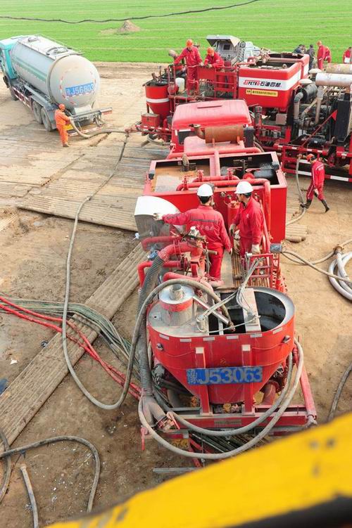 中原油田固井工程處正在濮深18-側(cè)1井進行完井固井施工