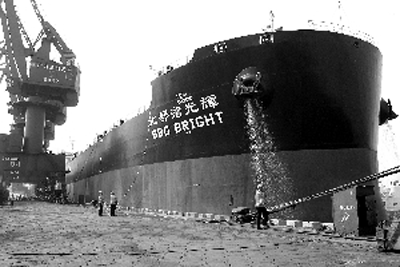 9月28日,滿載重晶石的巴拿馬型船舶北部灣光輝號,從廣西防城港首航駛往休斯敦新奧爾良港,成為廣西第一艘投入運營的遠洋船舶,填補了廣西沒有遠洋船舶的空白。圖為北部灣光輝號貨船正在防城港13號泊位碼頭裝貨。