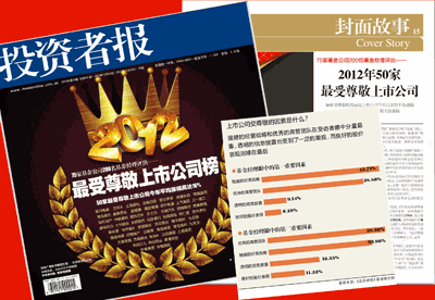 該榜單是由70家公募和5家主要的私募基金公司的優秀代表從200家大市值的上市公司中評出,他們從有誠信、有遠見、對投資者負責的企業的角度來評價這些公司的受尊敬程度。《投資者報》最后再根據每家公司的每項得票數,計算出公司的“受尊敬得分”并排名。