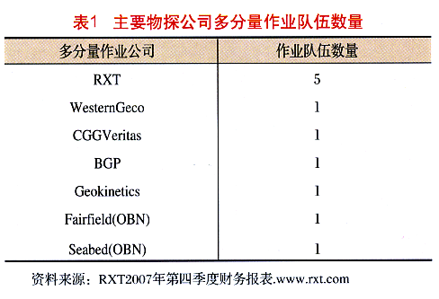 多分量地震(mu1ti-component seismic)技術(shù)是物探公司推出的新型海底地震采集系統(tǒng),采用四分量(4C)地震技術(shù)比原來的2C技術(shù)更復雜、更適合深水區(qū)域的地震勘探。目前,主要有了家物探公司的11支作業(yè)隊伍從事多分量作業(yè)(見表1)。RXT有5支作業(yè)隊伍,占多分量市場份額的45.6%。2006年,PGS將其多分量作業(yè)隊伍改裝成拖纜船,因此2008年P(guān)GS可能沒有OBC(海底電纜地震)作業(yè)隊伍。Fairfie1d和Seabed公司分別有一支4C-OBN(海底節(jié)點地震)作業(yè)隊伍,其余均屬2C、4C-OBC作業(yè)隊伍。OBC是采用電纜進行地震數(shù)據(jù)采集,而OBN地震采集系統(tǒng)可以采用無纜系統(tǒng)進行海底地震數(shù)據(jù)的采集,它有著比OBC重量更輕、采集道數(shù)大、采集效率高、成本低等特點。