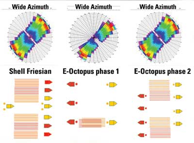 Phase 1 of E-Octopus used a single Q-Marine source/receiver boat and two laterally offset source boats. In Phase 2, an additional source/receiver boat was employed to speed up the acquisition. As can be seen by the polar plots in Figure 1, a much wider azimuth was achieved in Phase 2, quite similar to the one achieved in the Friesian project.