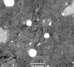 A two-dimensional slice through a shale. The dark areas are the pores. The white spots are high density framboidal pyrites. The gray areas are siliceous minerals. The light gray areas are carbonate minerals.