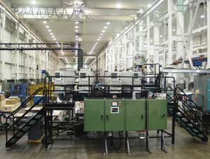 Global Resource Corp. completes prototype demonstration of its microwave energy recovery technology at Ingersoll Production Systems in Rockford, Ill. The huge prototype machine effectively moved material from input to output and held vacuum pressure under full automatic mode, successfully meeting expectations. This clears the way for the West Berlin, N.J., firm to launch commercialization. The microwave technology breaks down the hydrocarbons in shale, heavy oil, plastics, vinyl, and tires and turns it into hydrocarbon energy. (Image courtesy of Global Resource Corp.)