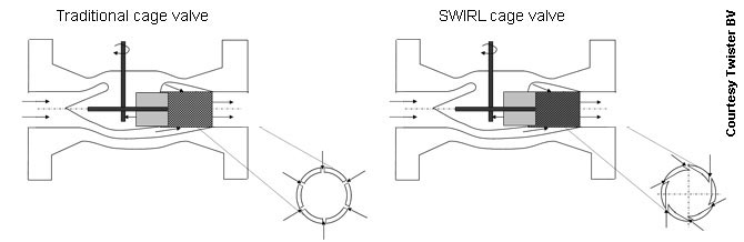 In conventional valves, flow is throttled over a perforated cylinder, or cage (L). These perforations normally have a radial orientation. The SWIRL valve's modified cage forces the flow into a swirling motion (R).