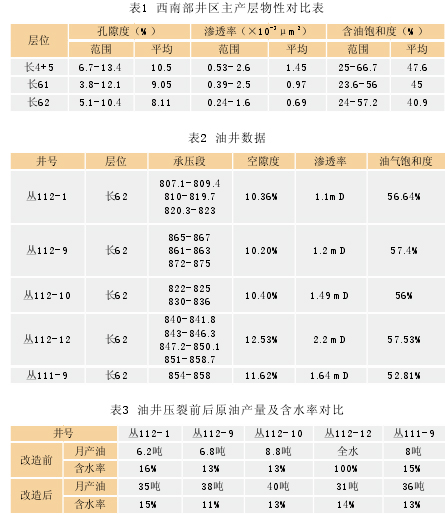 西南部為低孔特低滲儲層。長4+孔隙度為8~14%,平均為10%,主要分布在6.7~13.4%,平均為10.5%。滲透率為0.15~7.42×10-3μm2,平均為0.96×10-3μm2。主要分布在0.53~2. ×10-3μm2,平均為1.45×10-3μm2。長61孔隙度為7~12%,平均為9%,滲透率為0.15~7.21×10-3μm2,平均為0.79×10-3μm2。西南部井區主產層物 性對比見表1。長61在該區域也發育一套厚度比較大的砂體,有效厚度15~27米之間,且物性較好。這兩套開發層系將是今后穩產的主要區塊,目前正在該區實施分層注水。西南部區域27口取芯井中,有9口井出現天然垂直裂縫,占全部取芯井的33%,砂巖中的裂縫一般為垂直裂縫,縫面傾角近90度,裂縫在垂直方向延伸0.2~0.3米,縫面較平整,寬2毫左右。