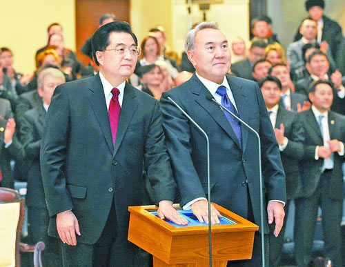 胡錦濤和納扎爾巴耶夫共同按下按鈕,開啟線路閥門。