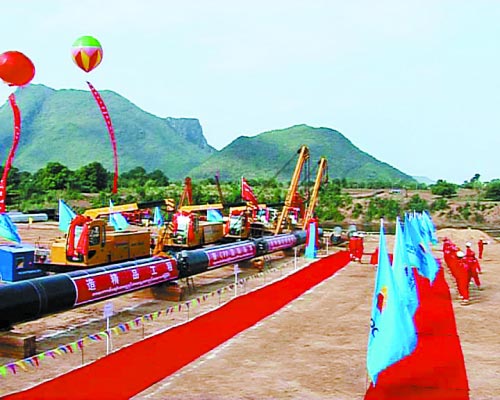 當地時間6月3日上午10時28分,在緬甸首都內比都,中國國務院總理溫家寶和緬甸聯邦政府總理登盛,共同觸摸標志中緬油氣管道開工的電子球。與此同時,位于緬甸米坦格河畔的管道施工現場機器轟鳴,焊花飛濺,中緬石油天然氣管道工程正式開工建設。