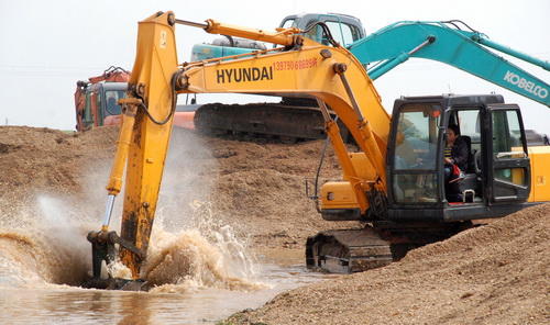 在河流大開挖施工中,管道三公司選派3個土方機組進行河道圍堰、開挖和倒土修路,當日僅土方機組就投入10臺挖掘機、50輛卡車和兩輛推土機,總共動用大型設備和車輛69臺套。