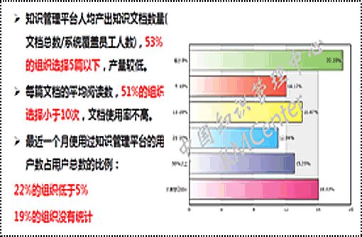 知識管理的重要性無需多言,但很多管理者認為這是一件“不可能完成的任務”。也的確有不少“慘烈”的例子,剛開始時轟轟烈烈,逐漸偃旗息鼓,最后費時費力上馬的知識管理系統,只做員工閑來翻翻之用。KM CENTER經過調研后,在其《中國知識管理現狀、問題和趨勢:2012中國知識管理實施調研結果分析》中給出了右圖的一組數據。