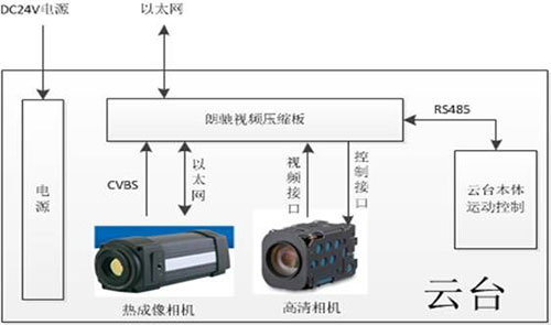 整個云臺通過以太網與機器人主控電腦連接,主控制器通過網絡對紅外熱成像、高清相機和云臺運動進行控制。熱成像輸出CVBS模擬視頻和高清相機數字視頻通過視頻壓縮板進行H264編碼壓縮,再傳輸到主控電腦。熱成像測溫數據通過以太網接穿透視頻壓縮板直達主控制器,向主控制器提供每秒多幀的全屏測溫數據、最高最低溫信息,同時也根據被測溫設備特性從主控制獲取輻射率、距離、區域信息等,結合機器人的精確預置位能力,可以有效保證測溫的準確性和多次測溫數據的數據可對比性。
