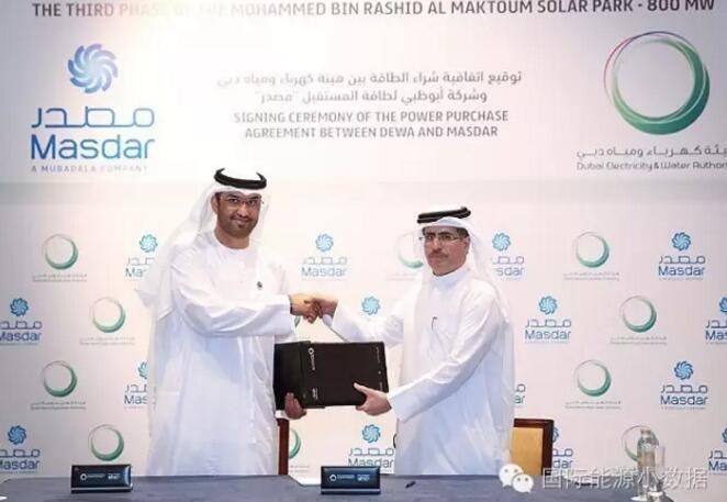 2016年11月29日,迪拜電力和供水機構(DEWA)與阿布扎比未來能源公司(Masdar)正式簽署了迪拜(Mohammedbin Rashid Al Maktoum Solar Park)光伏園第三期800兆瓦項目的購電協議,成交價格為0.299美分/千瓦時,創全球歷史上最低的光伏價格。