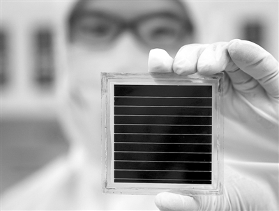 我國在鈣鈦礦電池研發領域取得重要突破。上海交通大學韓禮元教授團隊和蘇州黎元新能源科技有限公司合作研發,使面積36平方厘米鈣鈦礦太陽能組件的能量轉化效率突破了12%。圖為12月14日,技術人員在展示鈣鈦礦太陽能薄膜電池器件。新華社記者陳飛攝