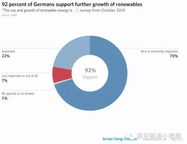 德國能源轉型,發電總量中可再生能源比例已經超過30%,而居民電價也在歐洲國家中相對比較高。然而,民意調查顯示,德國民眾中92%支持能源轉型(70%認為能源轉型非常重要、22%認為能源轉型比較重要),只有8%的民眾對能源轉型持負面態度。