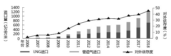 中國天然氣進(jìn)口量及對外依存度變化(來源:2018年國內(nèi)外油氣行業(yè)發(fā)展報(bào)告)